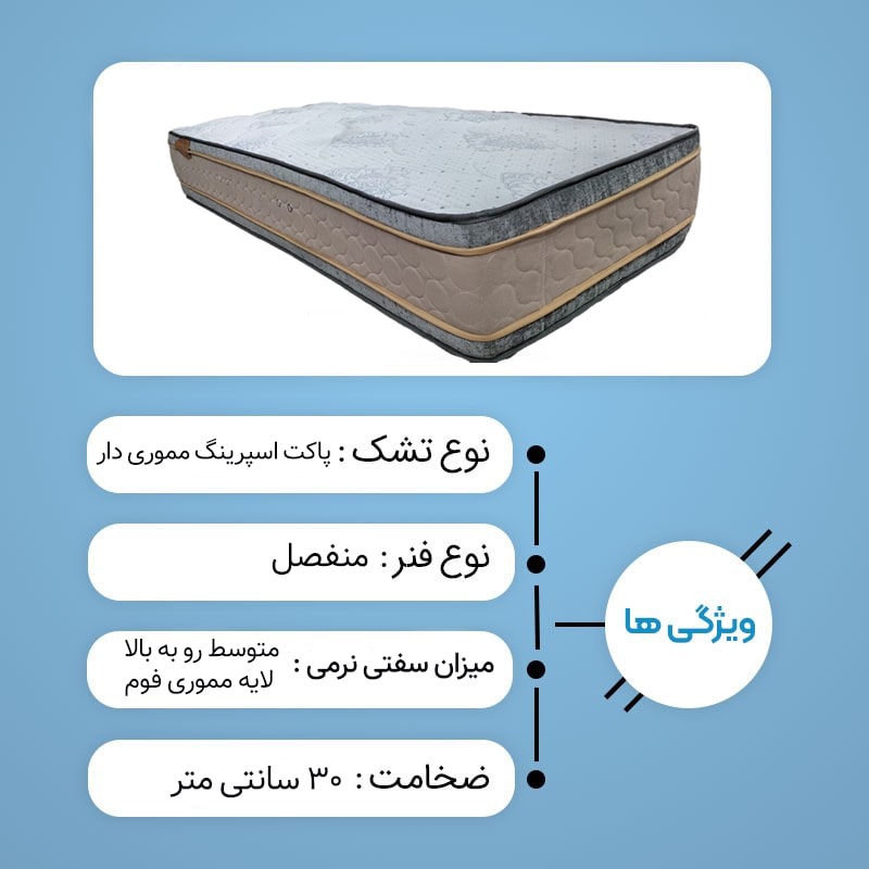 - استفاده از فنرهای منفصل پاکتی و اسفنج یورتان و ریباند و پارچه گردبافت و لایه مموری فوم در طراحی و تولید